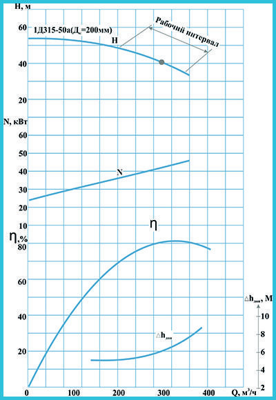 Насос 1Д315-50а из-за наличия двустороннего рабочего колеса и двустороннего подвода жидкости имеют хорошую всасывающую способность и кавитационные качества.